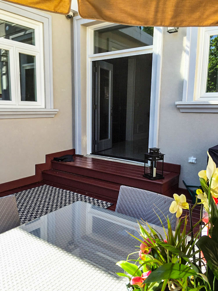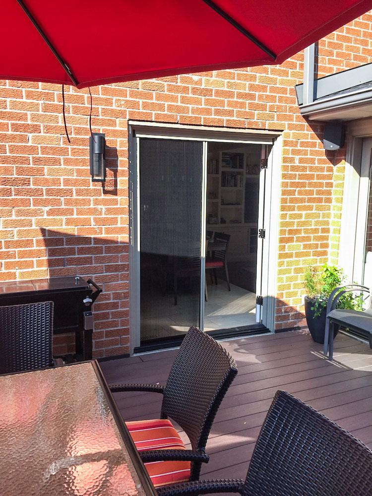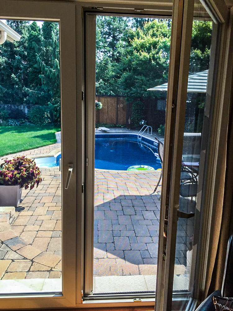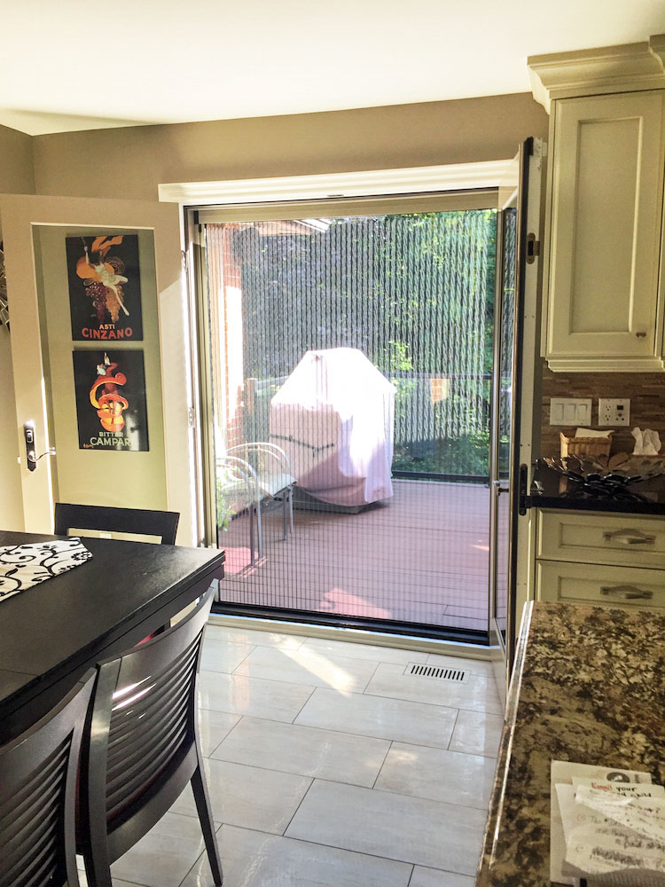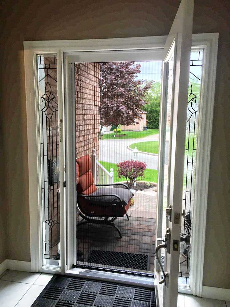 I did my homework and contacted all the top screen door manufacturers and none had what I was looking for. They were either bulky, or the bottom track was too high and people could easily trip and fall, or they didn't have the matching color.